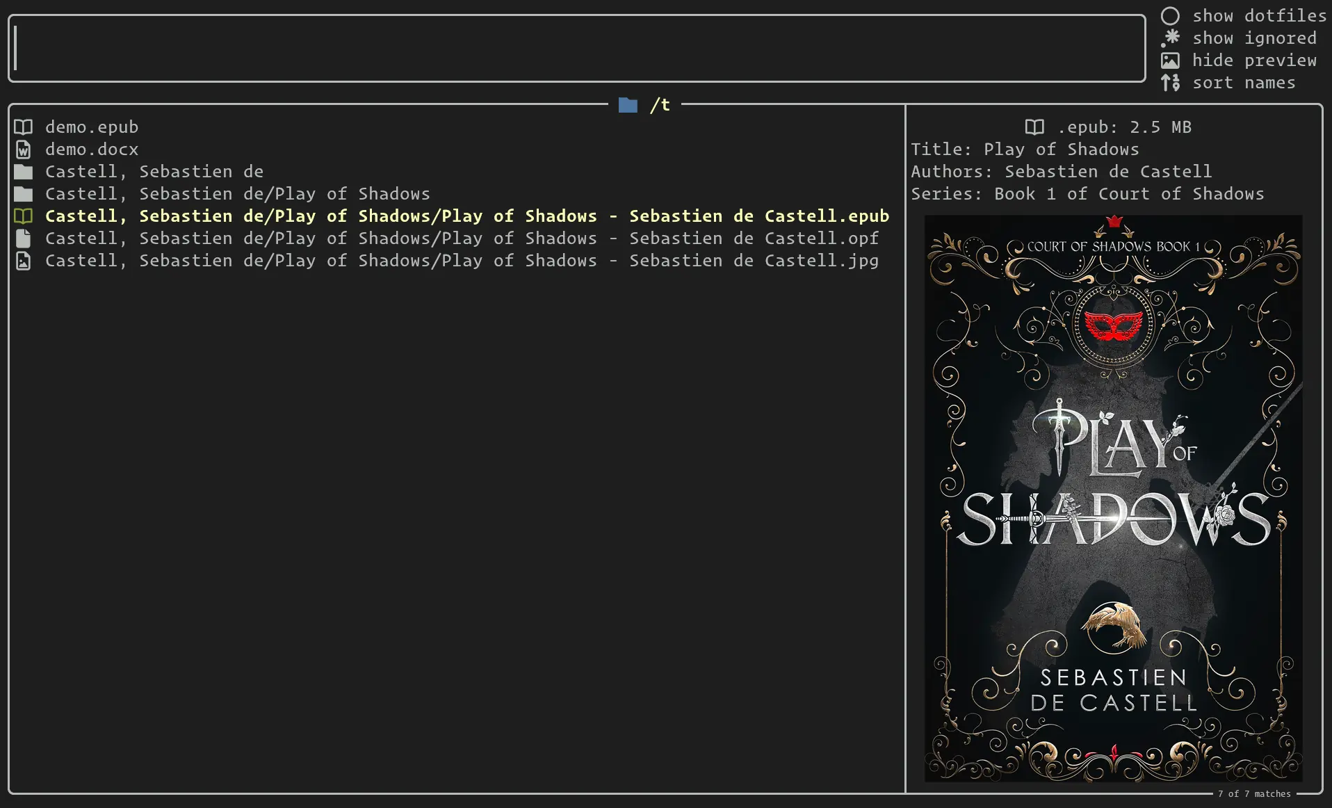 The choose-files kitten is designed to allow you to select files, very fast, with just a few key strokes. It operates like fzf and similar fuzzy finders, except that it is specialised for finding files. As such it supports features such as filtering by file type, file type icons, content previews and so on, out of the box. It can be used as a drop in (but much more efficient and keyboard friendly) replacement for the File open and save dialog boxes common to GUI programs. On Linux, with the help of the desktop-ui kitten, you can even convince most GUI programs on your computer to use this kitten instead of regular file dialogs.